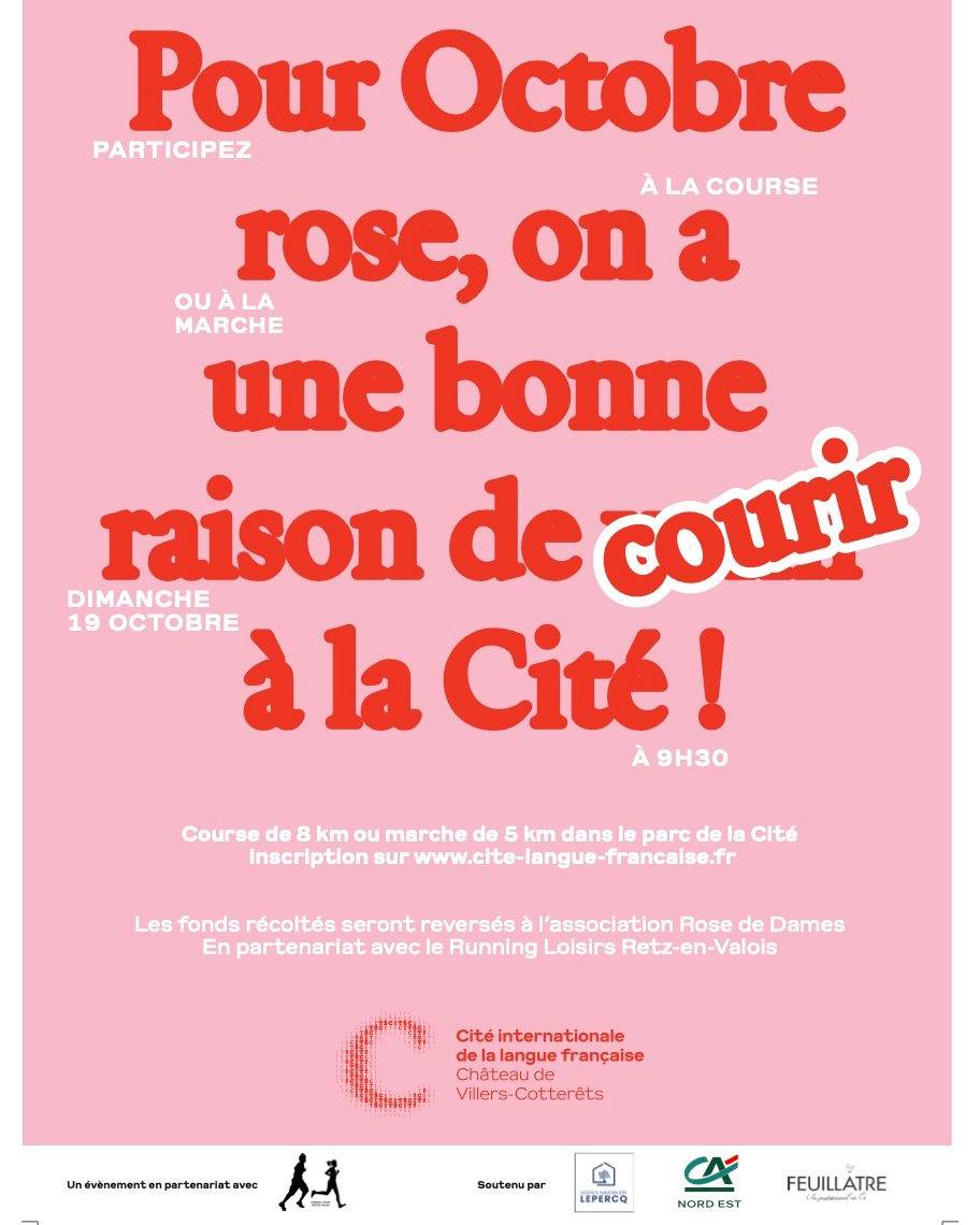 Nous sommes fiers de soutenir la 1ère course Octobre Rose à la Cité Internationale de la Langue Française, organisée avec le Running Club de Villers.
